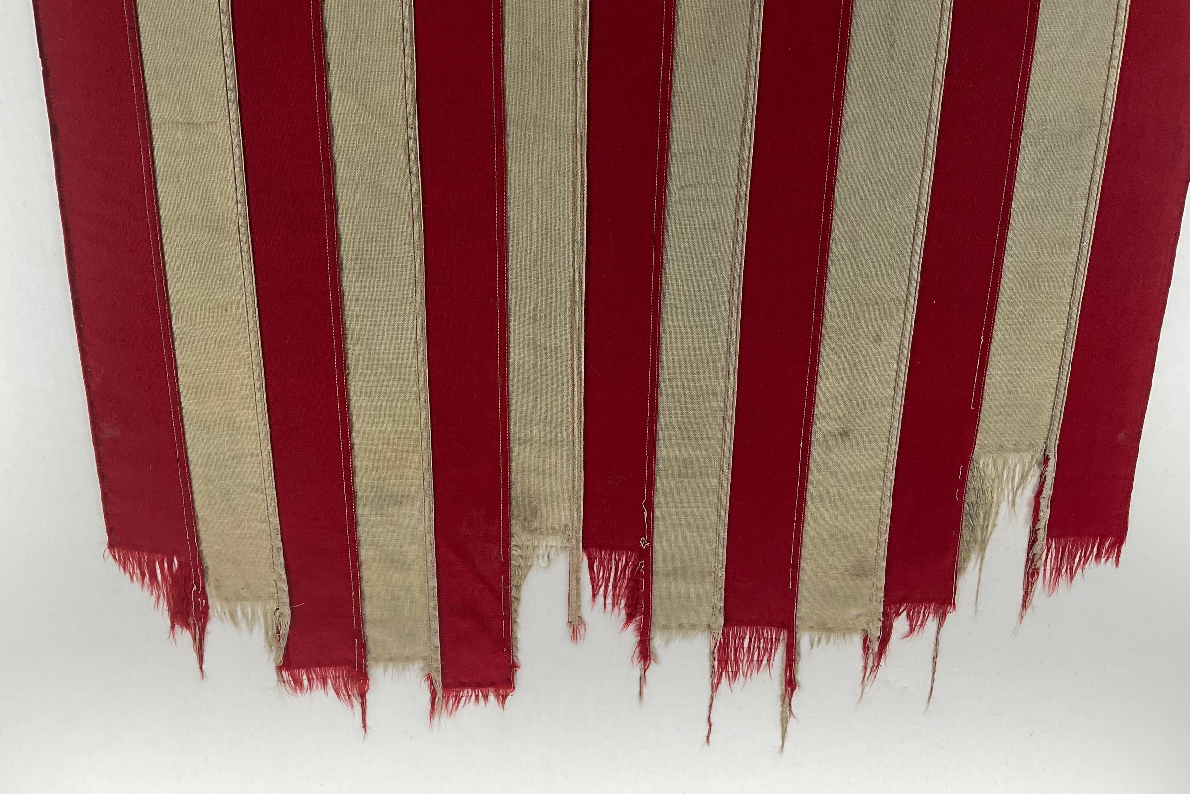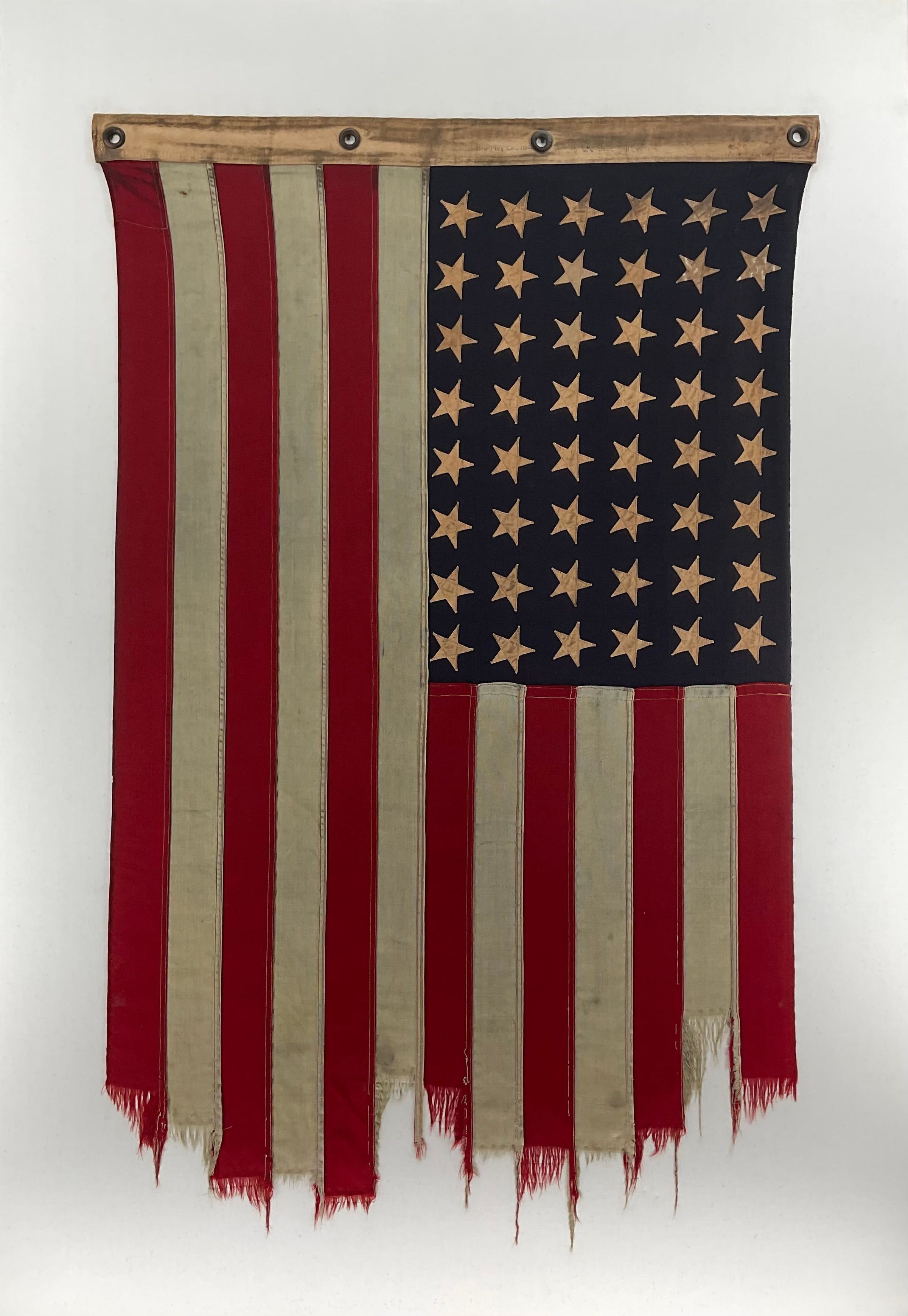 A 48-star US flag flown aboard USS Laffey (DD-724) in combat off Okinawa. The fly end is damaged from wear and time.Use