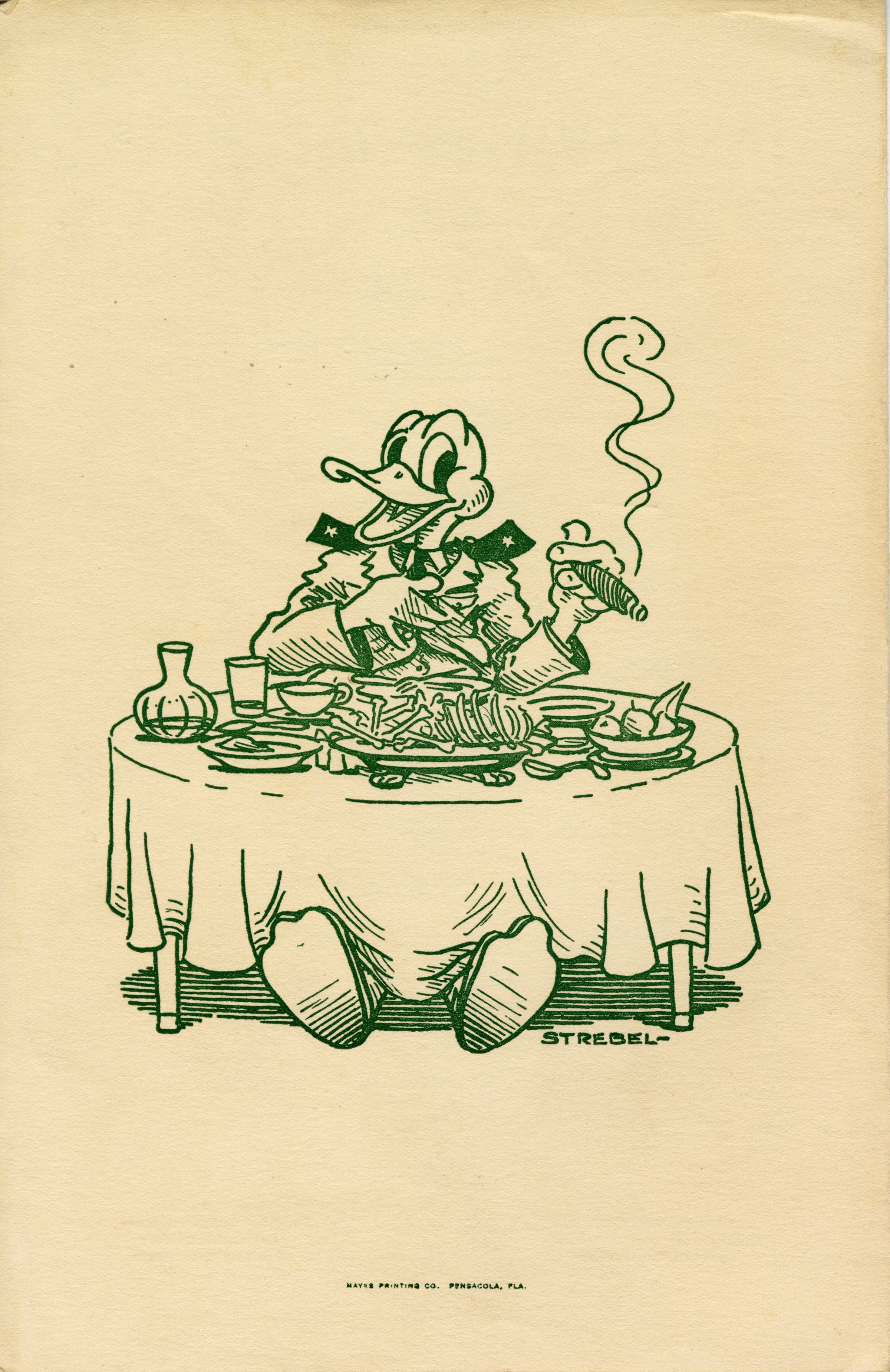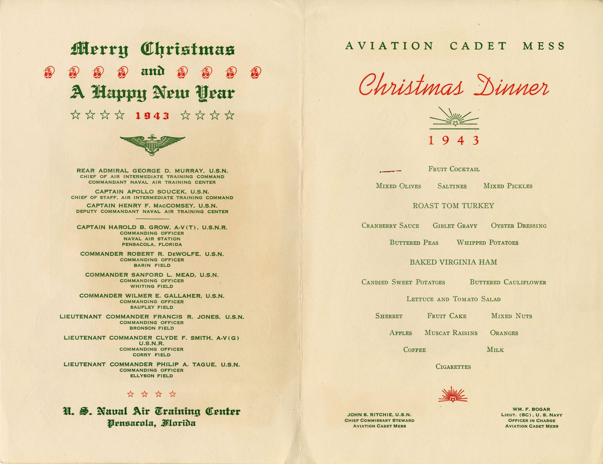 This Christmas menu was for the 1943 Christmas Dinner at the US Naval Air Station (NAS) at Pensacola, Florida. The menu features classic holiday fare such as roasted turkey, baked ham, cranberry sauce, and candied sweet potatoes.Context