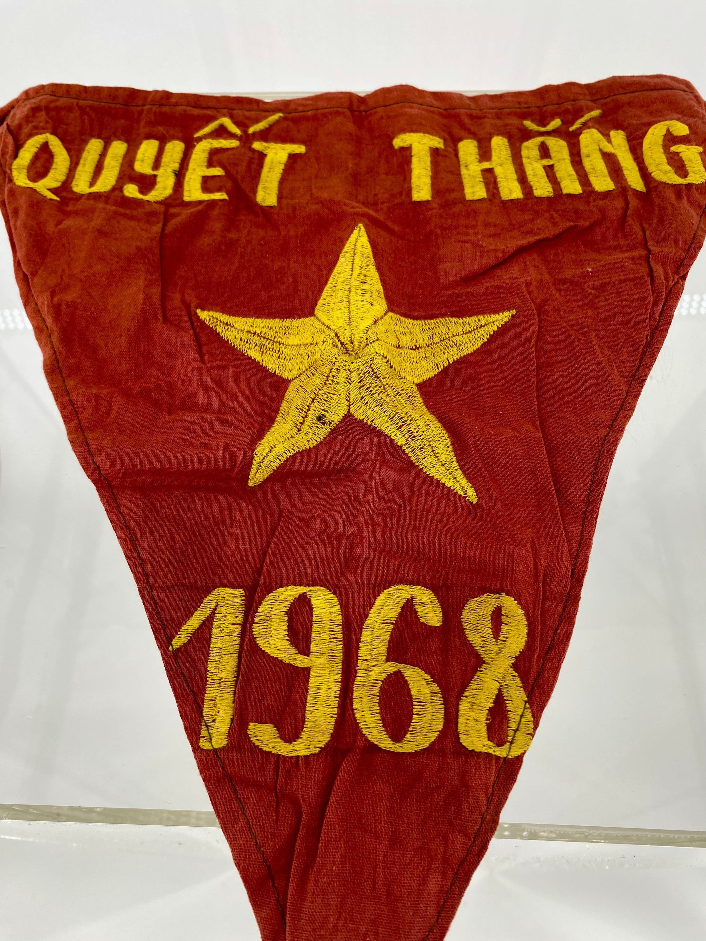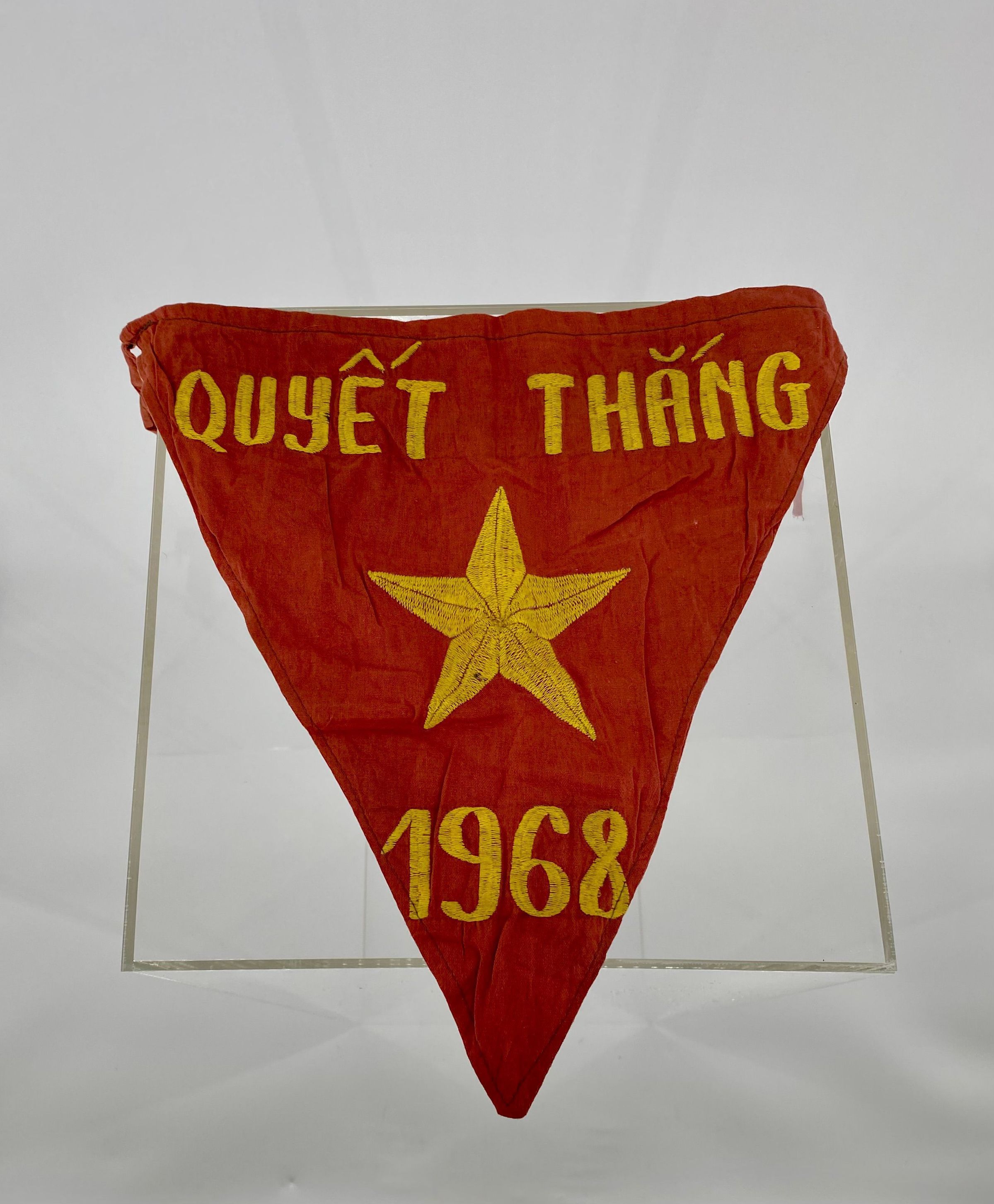 A red, inverted triangle-shaped pennant with a yellow star in the center. There is loose cloth string at either end to facilitate tying the pennant. The words 'quyet thang' across the top of the pennant and '1968' across the bottom. ''Quyết thắng" roughly translates as 'decided to win.'Use