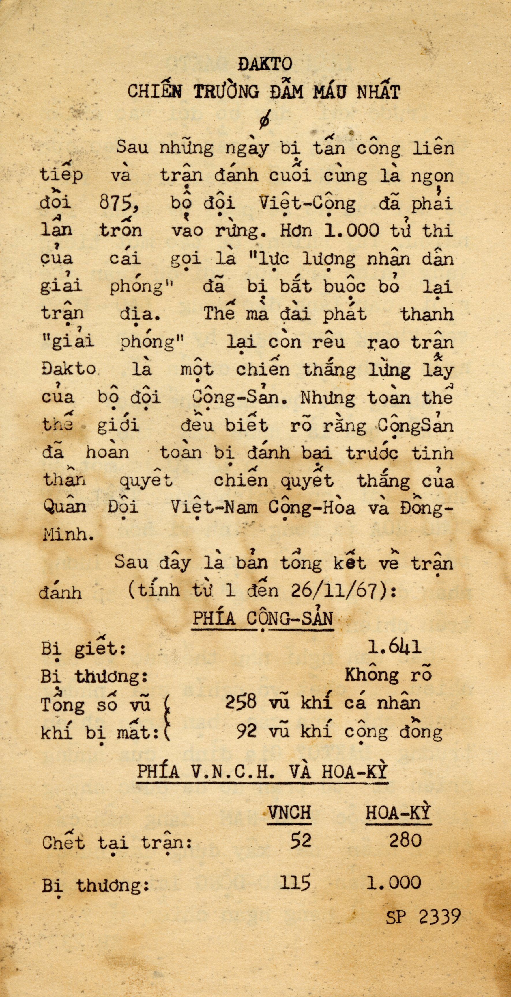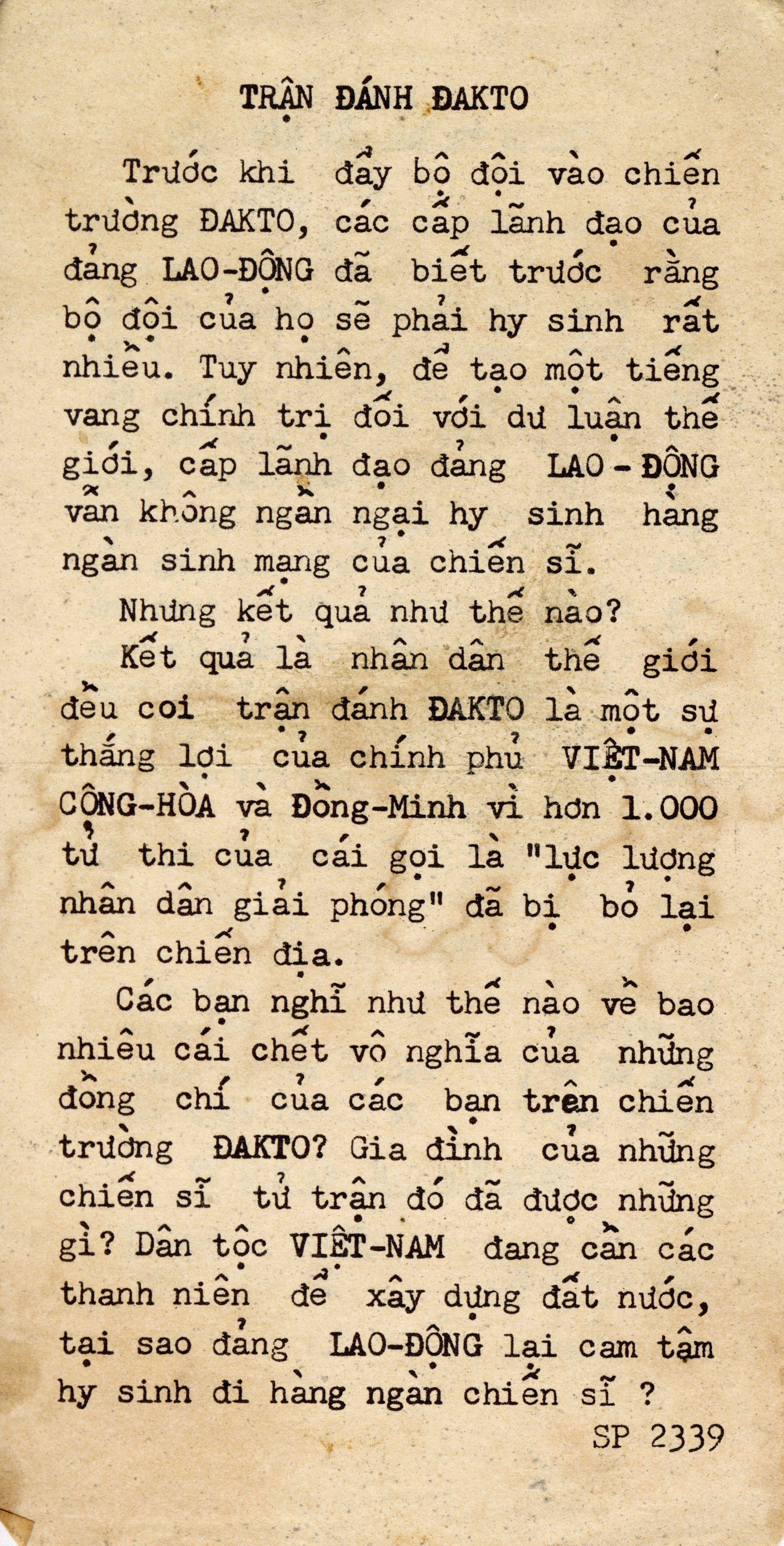 This American propaganda leaflet is a response to North Vietnamese claims that they had won the battle of Dak To. This leaflet attempts to counter that narrative by asserting that the Viet Cong were forced to retreat while taking heavy casualties.Context