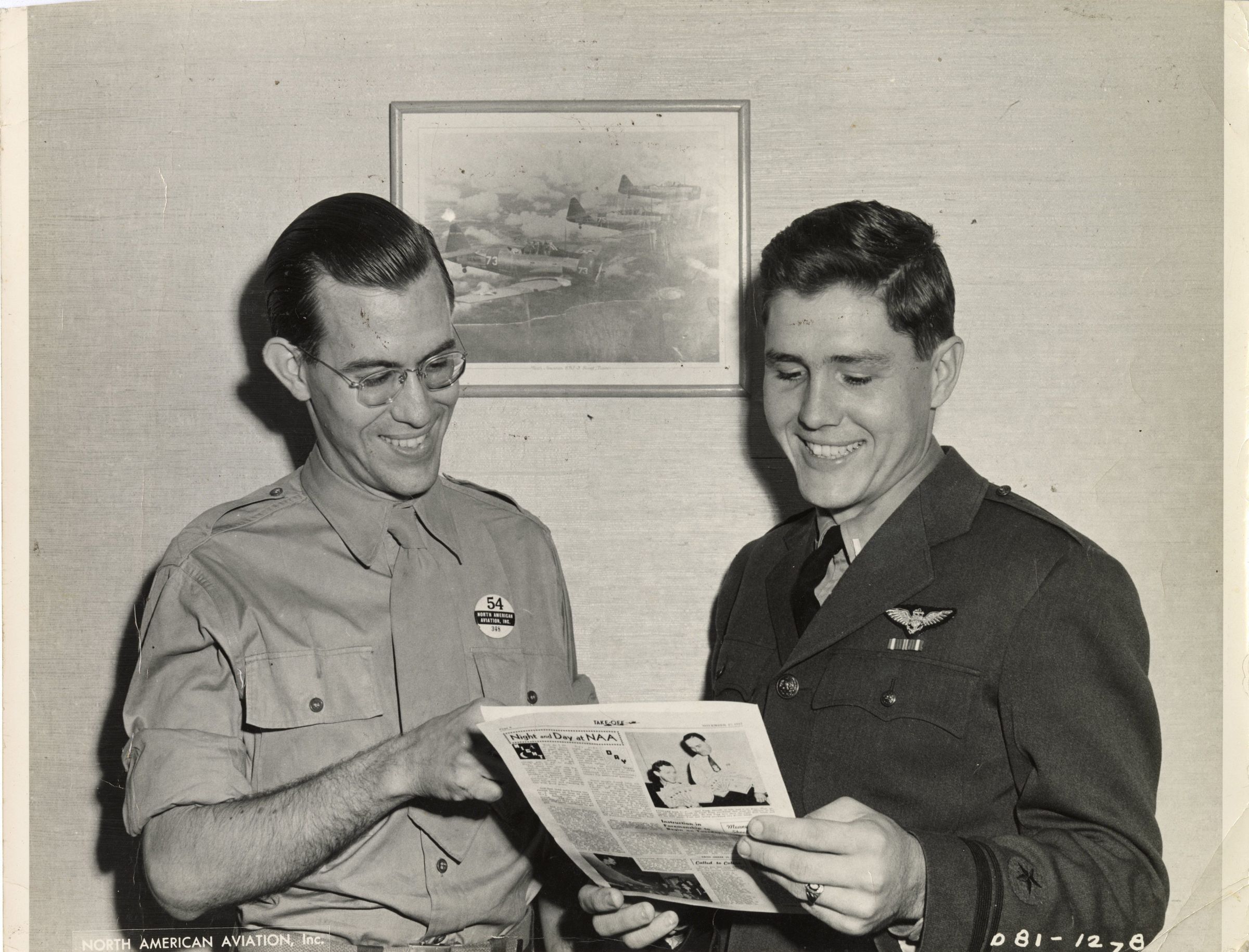 Smokey Stover and an official from North American Aviation smiling as they look over a copy of the "Take Off" Newsletter.Context