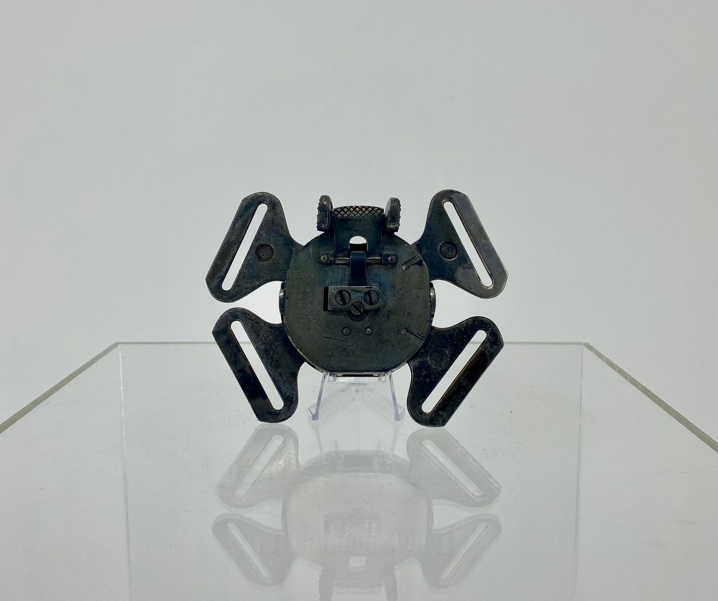 A four-point metal buckle consisting of the central latch and four latch plates. There is a Japanese Imperial Navy anchor motif stamped on all the latch plates and on the bottom of the central latch. The latch plates are all locked in place, though no fabric remains.Use