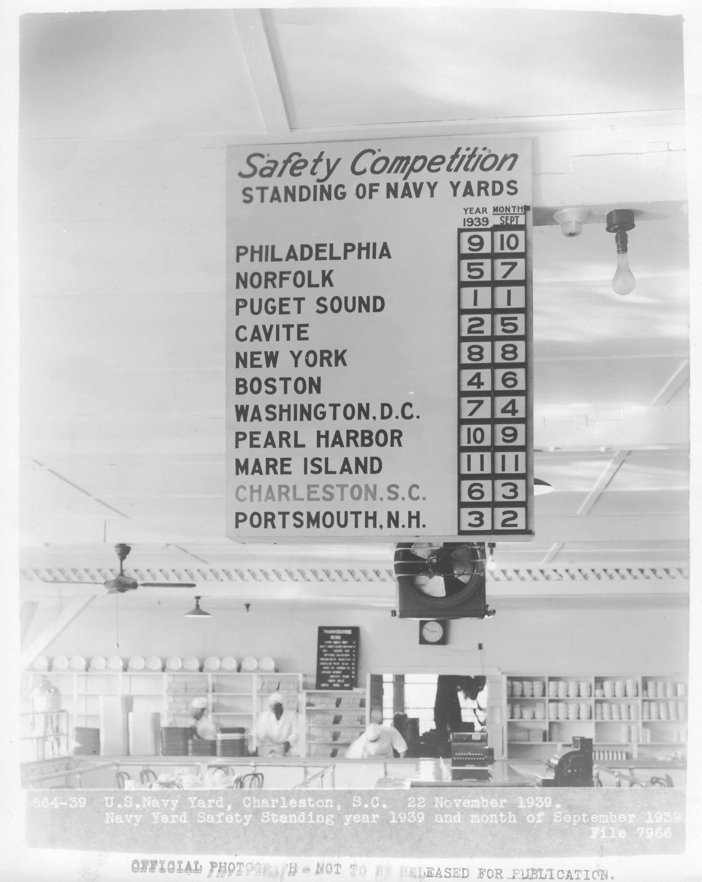 "564-39 US Navy Yard, Charleston, SC 22 November 1939. Navy Yard Safety Standing year 1939 and month of September 1939. File 7966."Update Date