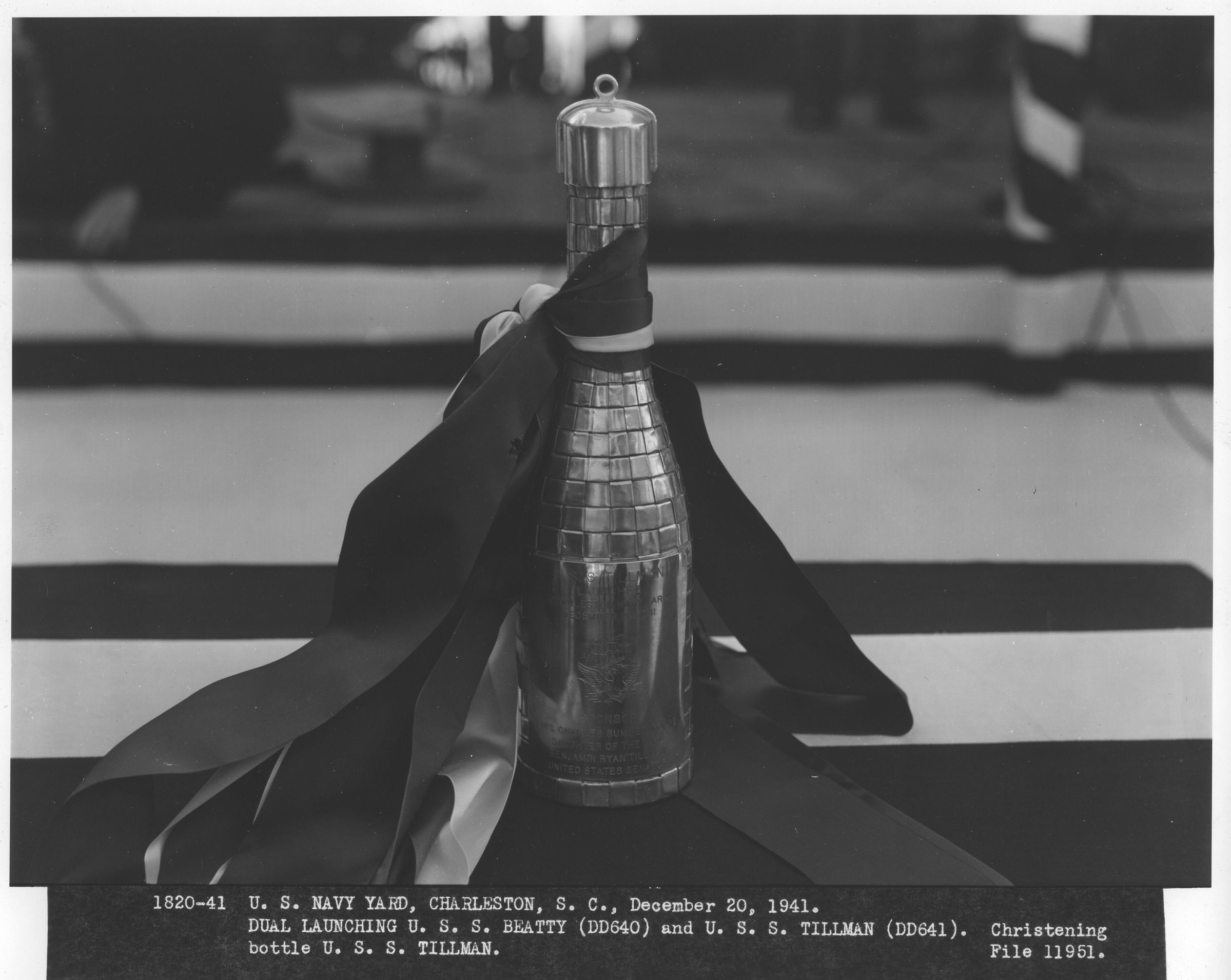 A black and white photo of the christening bottle used for the USS Tillman (DD-641) and the USS Beatty (DD-640) during dual christening ceremonies at the Charleston Naval Shipyard on December 20, 1941.Context