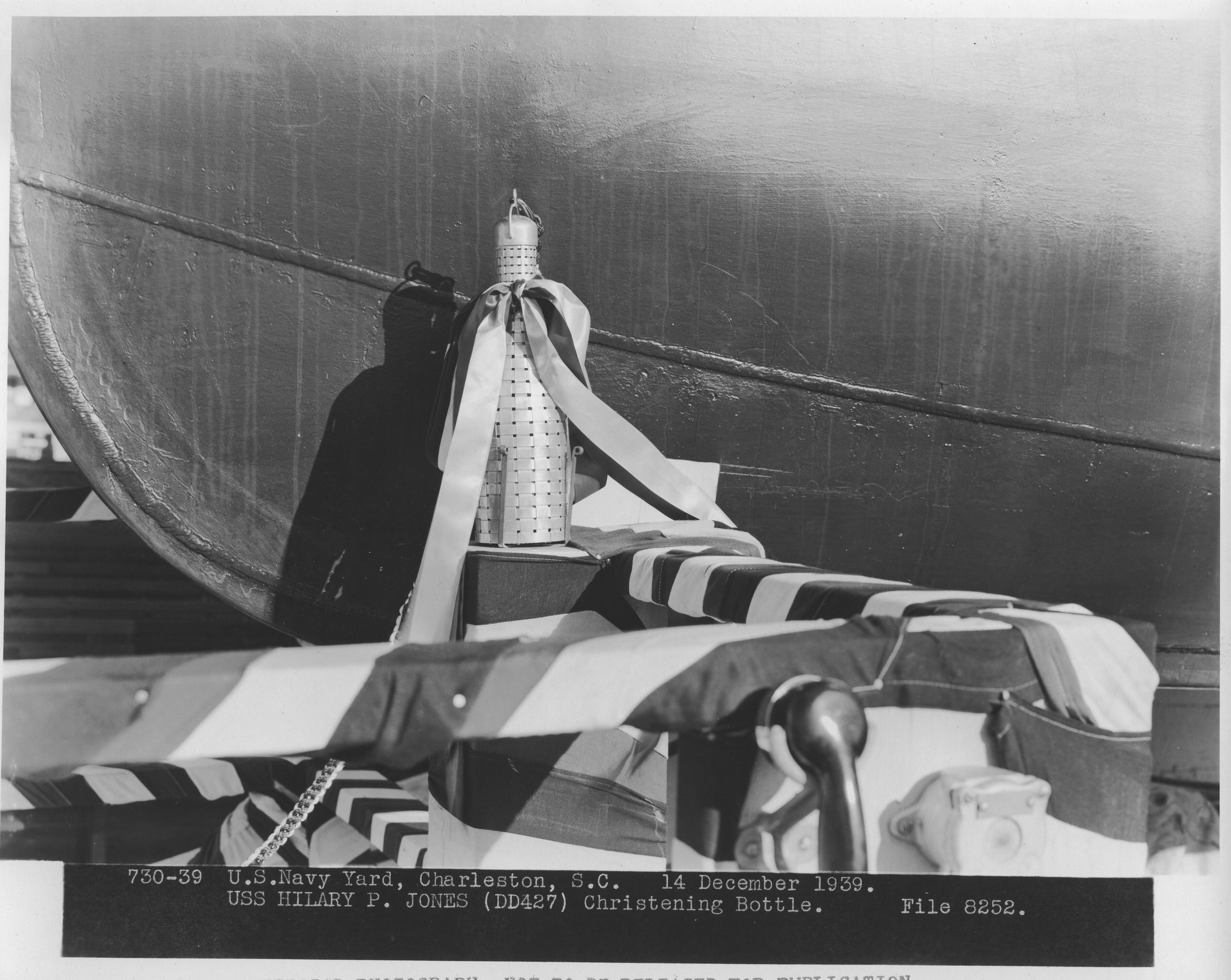 "730-39 US Navy Yard, Charleston, SC. 14 December 1939. USS Hilary P. Jones (DD 427). Christening Bottle. File 8252."Update Date