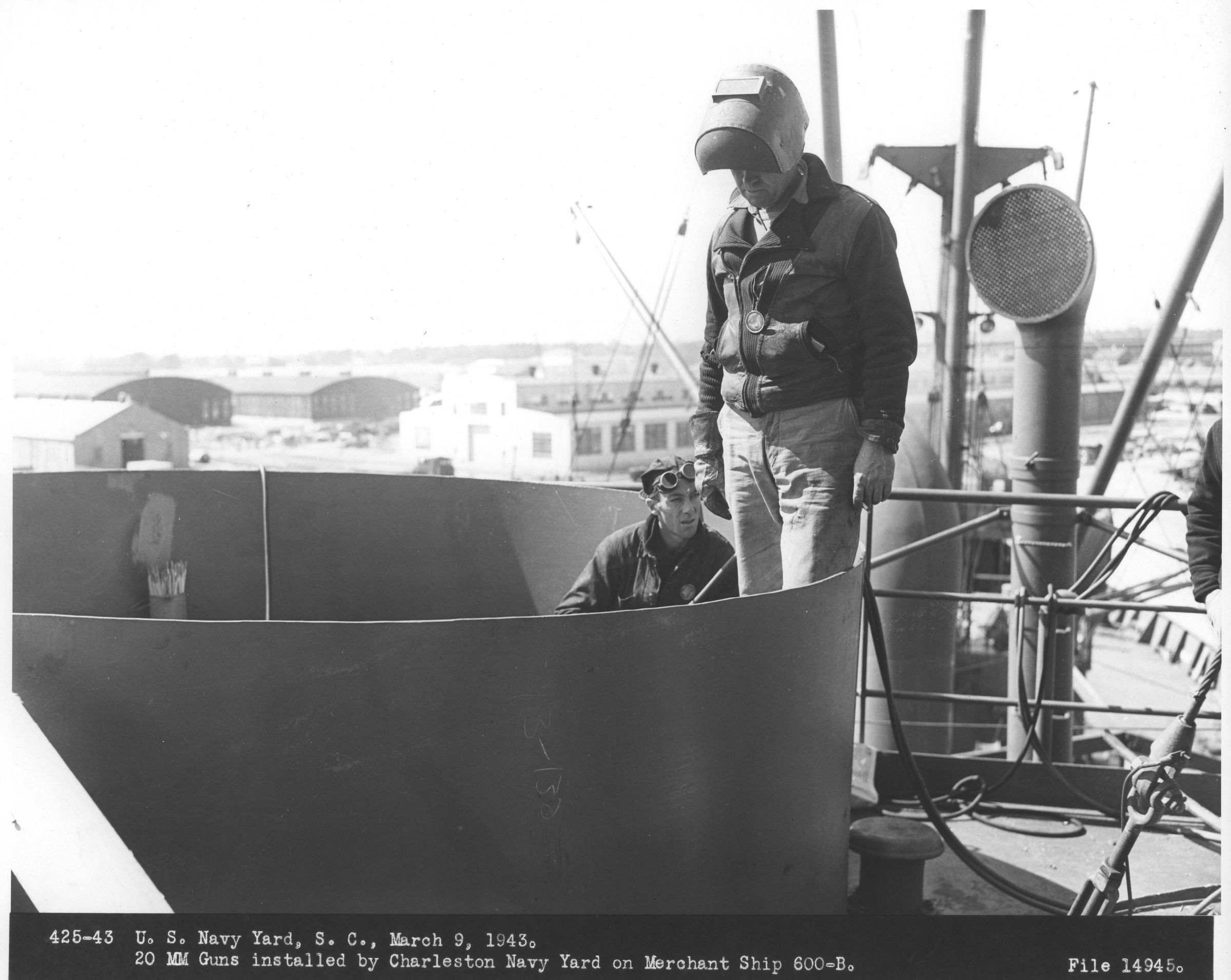 A photo of two men installing the 20mm guns on Merchant Ship 600-B at the Charleston Navy Shipyard on March 9, 1943.Context