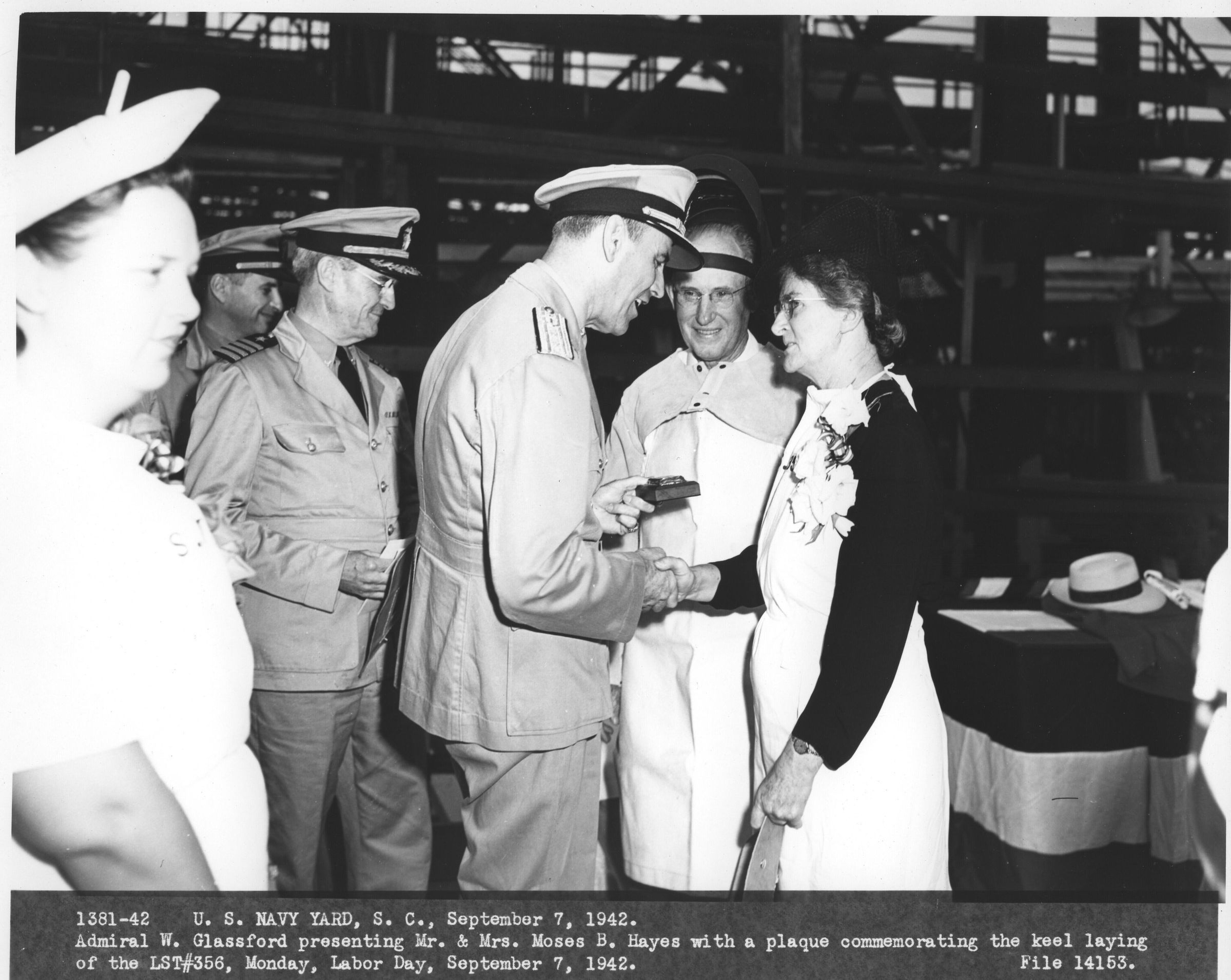 A black and white photo of Admiral William Glassford presenting Mr. and Mrs. Moses and Minnie Hayes with a plaque commemorating the keel-laying of LST 356. The presentation took place at Charleston Navy Shipyard on September 7, 1942.Context