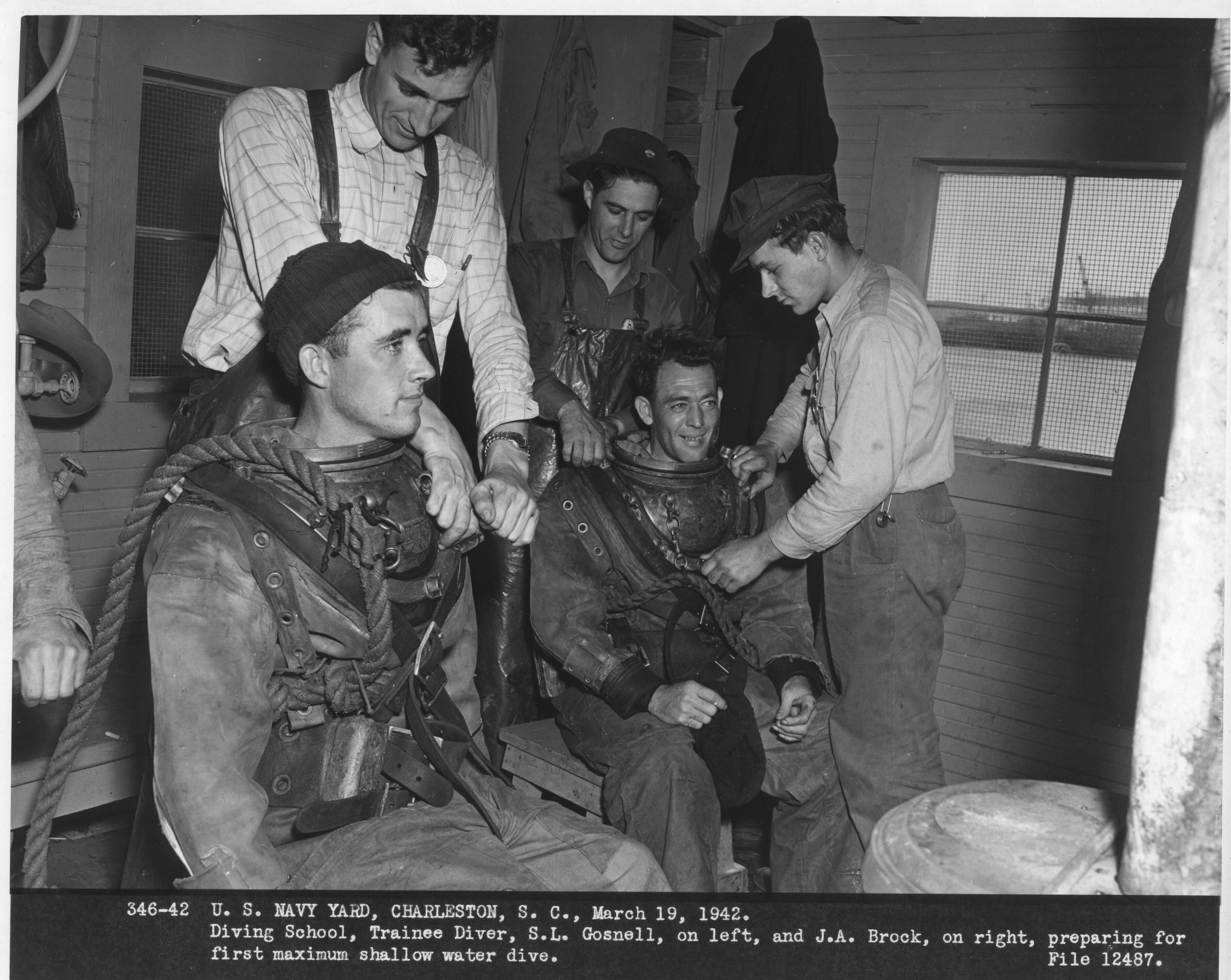 "346-42, US Navy Yard, Charleston, SC, March 19, 1942, Diving School, Trainee Diver, S. L. Gosnell, on left, and J. A. Brock, on right, preparing for first maximum shallow water dive. File 12487."Update Date
