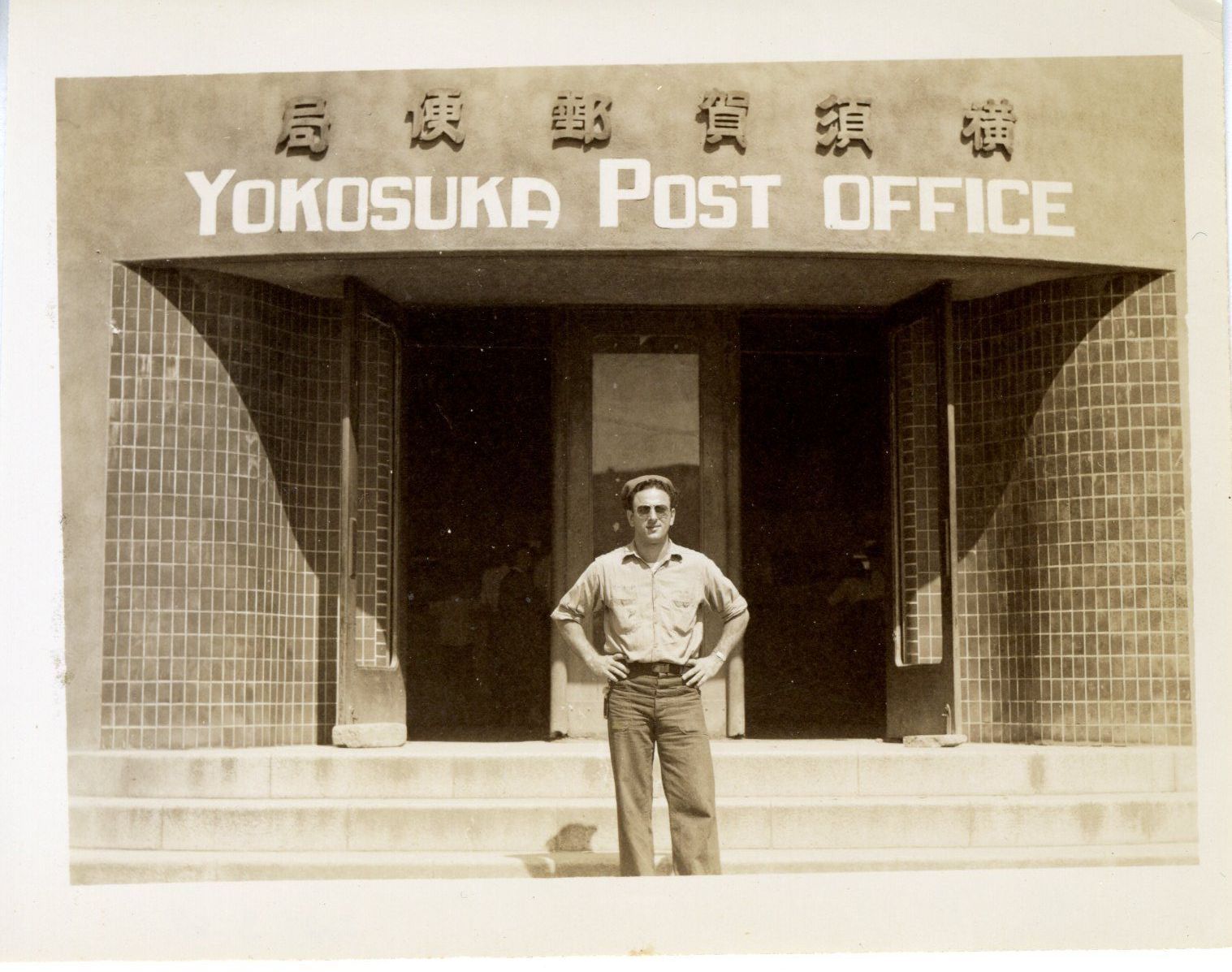 A black and white photograph of a USS Yorktown sailor standing outside the Yokosuka Post Office in Tokyo. The photo is from an album containing 53 photographs taken by Warren Tucker and his friends during the USS Yorktown (CV-10) crew liberty in Tokyo, Japan in September of 1945.