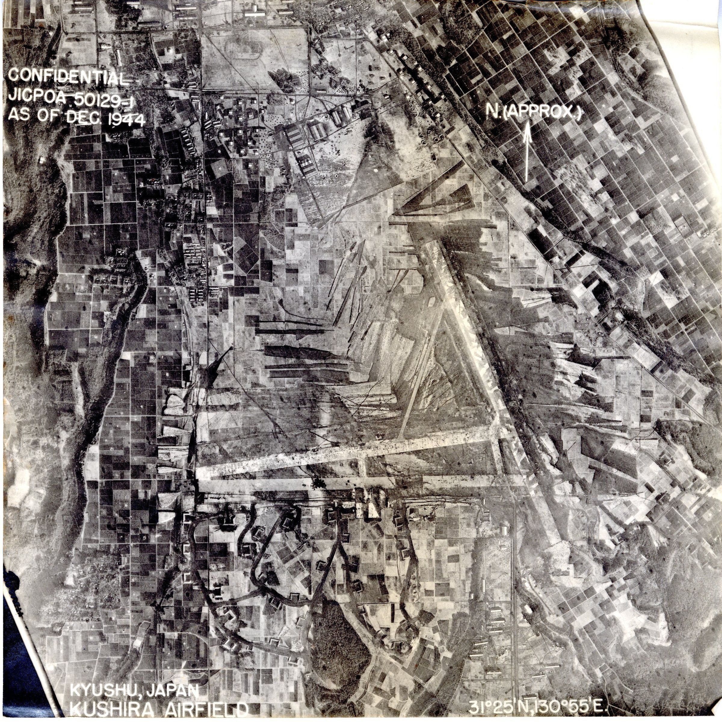 Aerial reconnaissance photograph taken in December 1944 of the Kushira Airfield on Kyushu, Japan in preparation for air attacks on the Japanese home islands.Context