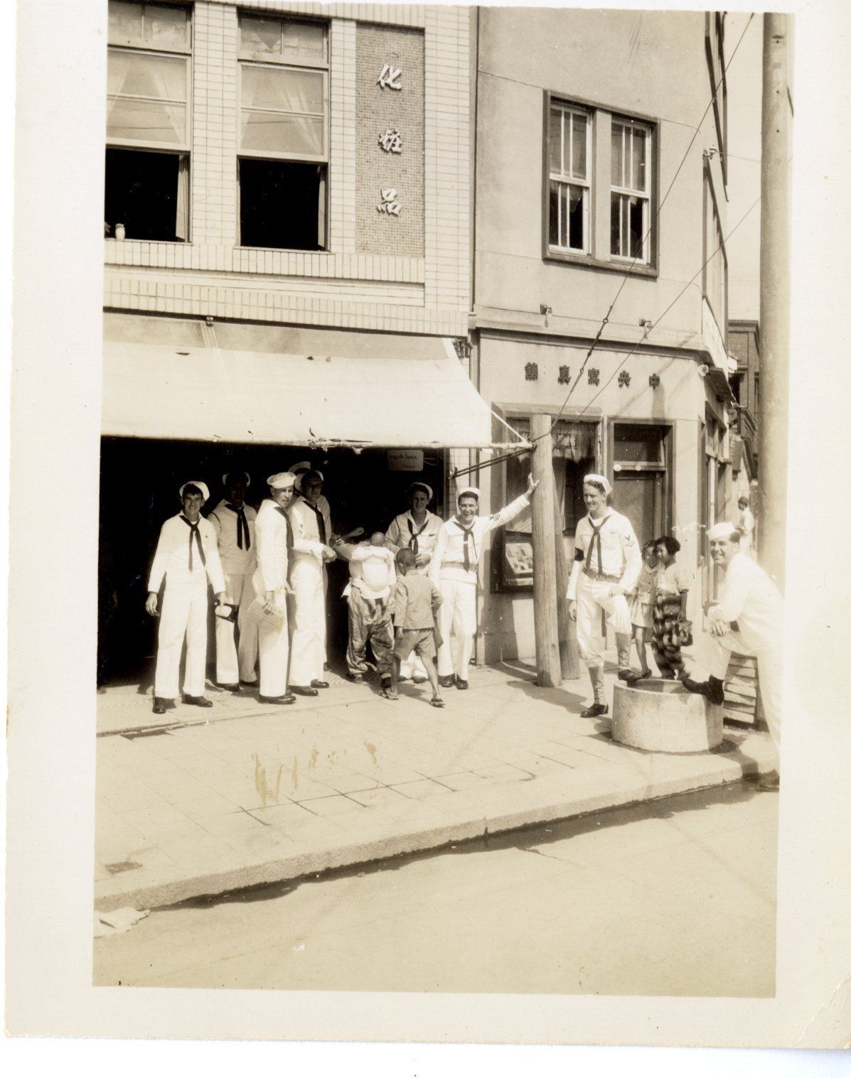 A black and white photograph of USS Yorktown sailors standing outside a small Japanese store in Tokyo. The photo is from an album containing 53 photographs taken by Warren Tucker and his friends during the USS Yorktown (CV-10) crew liberty in Tokyo, Japan in September of 1945.