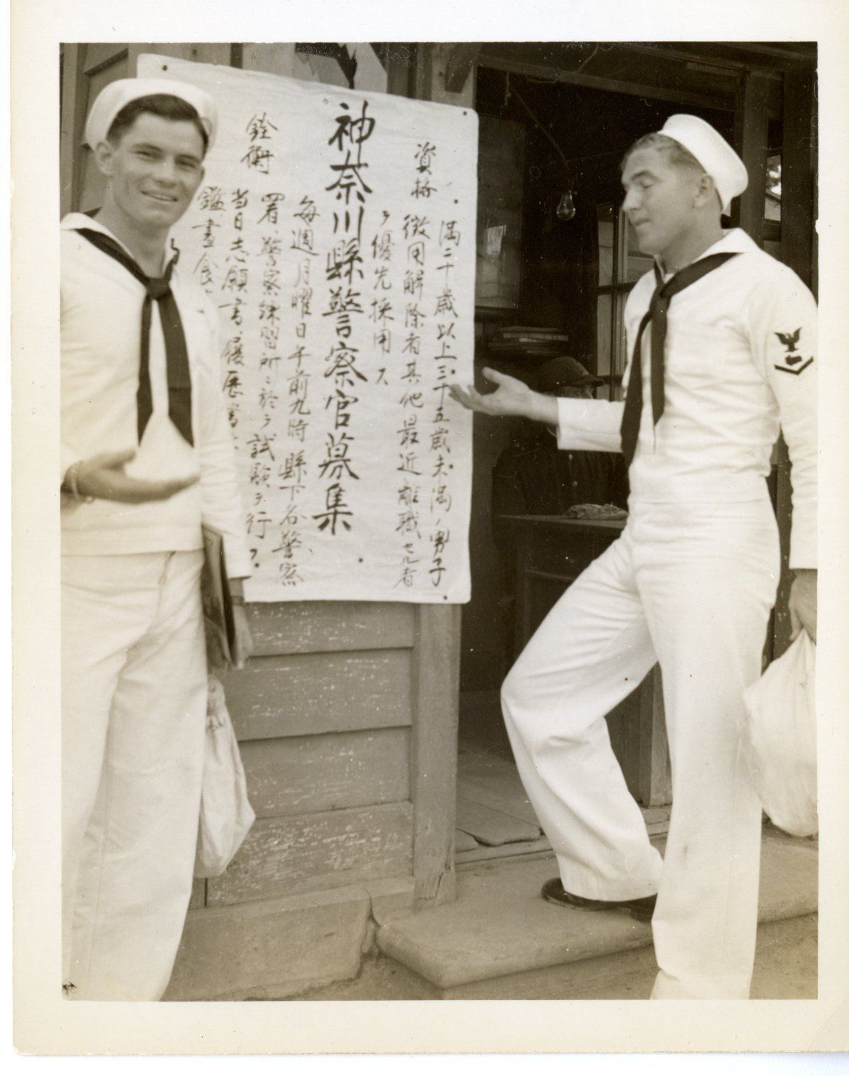 A black and white photograph of two USS Yorktown (CV-10) sailors, Melvin Womble (left) and Bill Tucker (right), pointing to a sign in Tokyo. The photo is from an album containing 53 photographs taken by Warren Tucker and his friends during the USS Yorktown (CV-10) crew liberty in Tokyo, Japan in September of 1945.