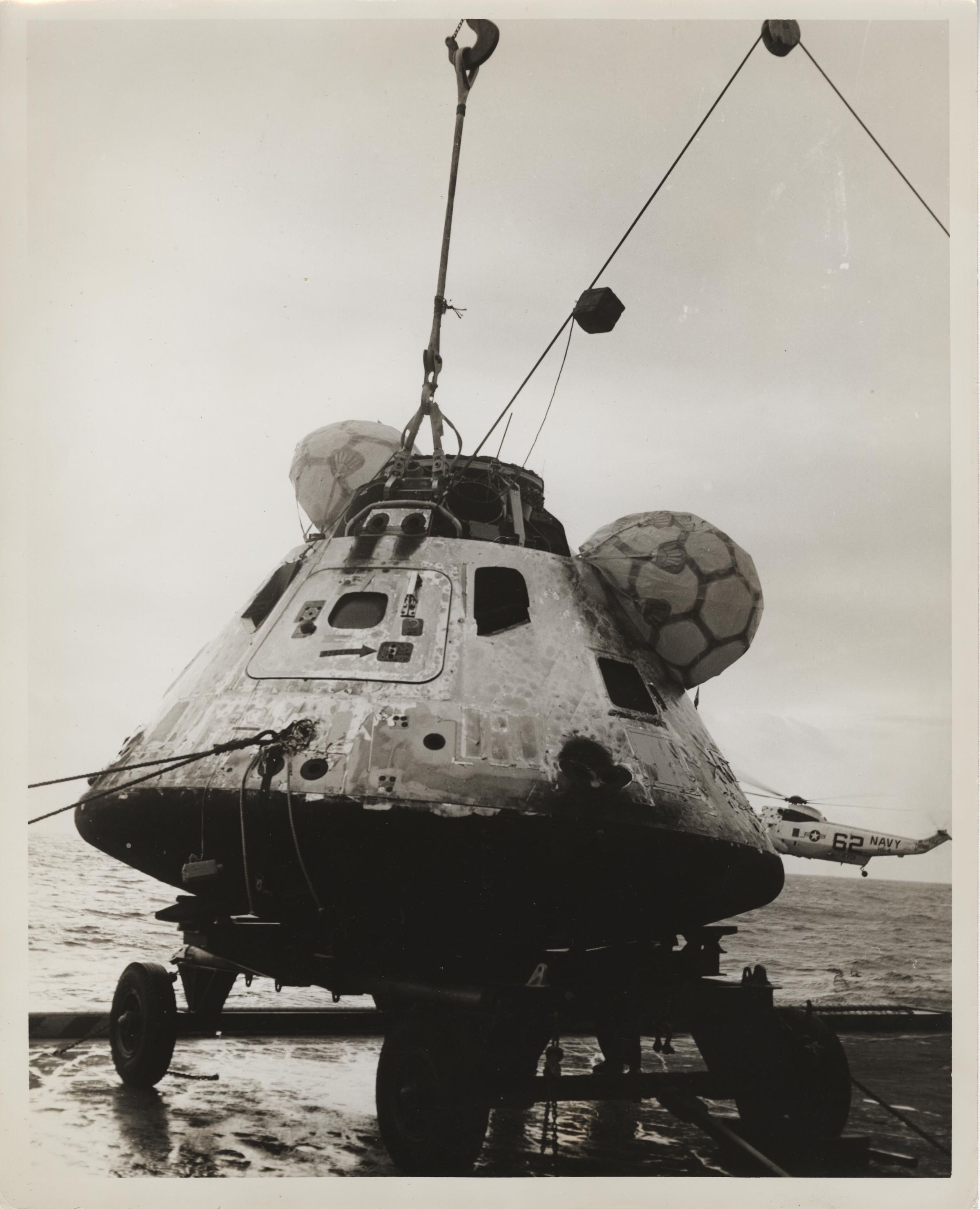 Photograph of the Apollo 8 capsule, with its flotation devices still attached, being lifted aboard the USS Yorktown (CVS-10). A SH-3 Sea King can be seen in the background.Context