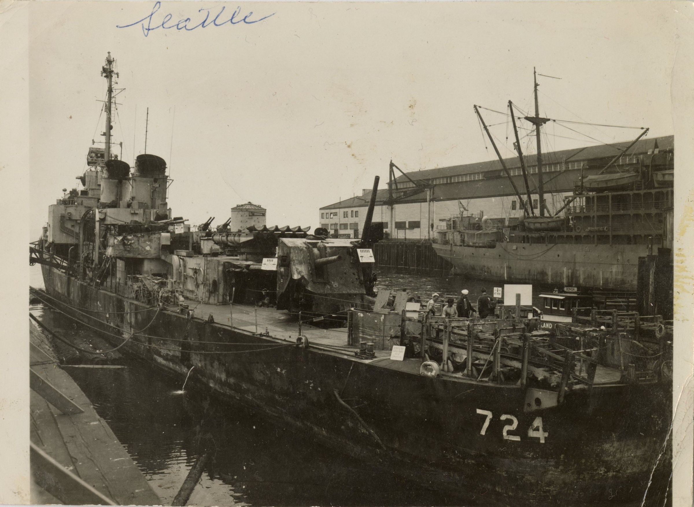 Black and white photograph of the USS Laffey (DD-724) tying up to the pier prior to its battle damage repairs in Seattle.