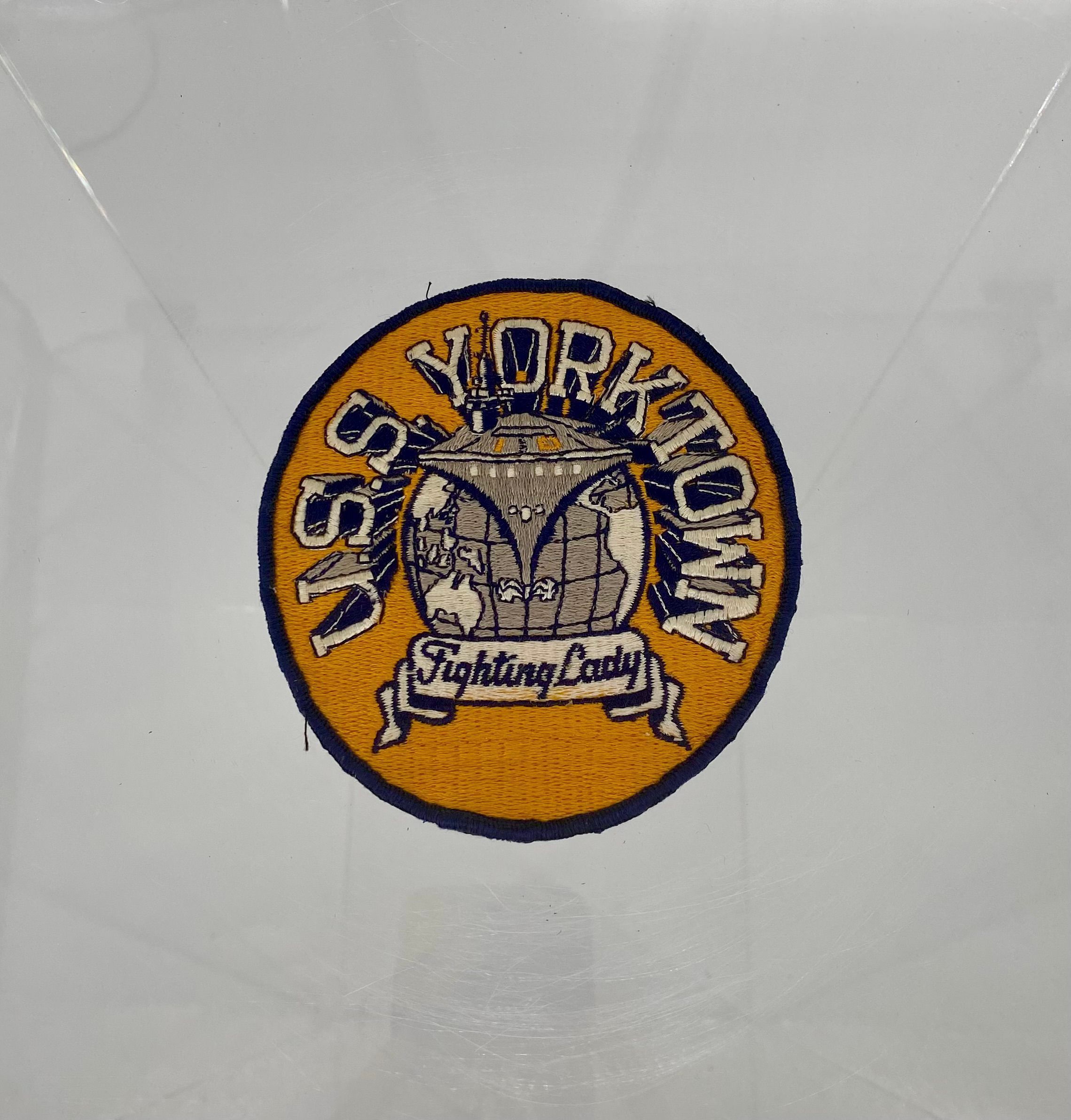 An embroidered yellow, blue and white patch with the image of the USS Yorktown sailing over a globe. Th patch reads "USS Yorktown" and "Fighting Lady."Use