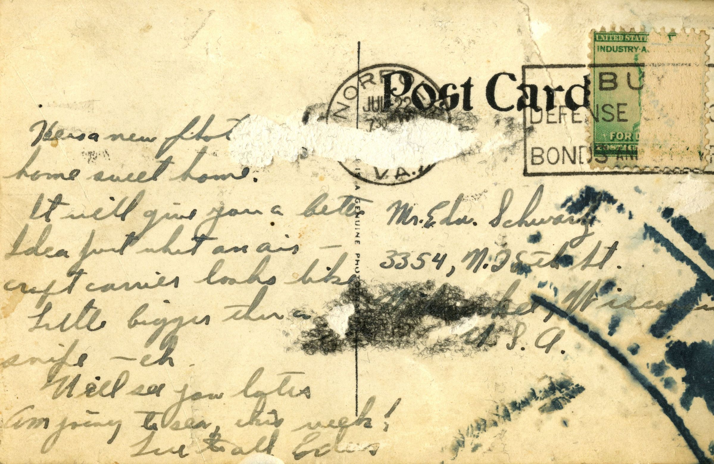 A postcard of the USS Yorktown (CV-5) showing off the brand new aircraft carrier. A short letter to Ed Schwartz's mother is penned on the back.Context