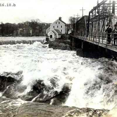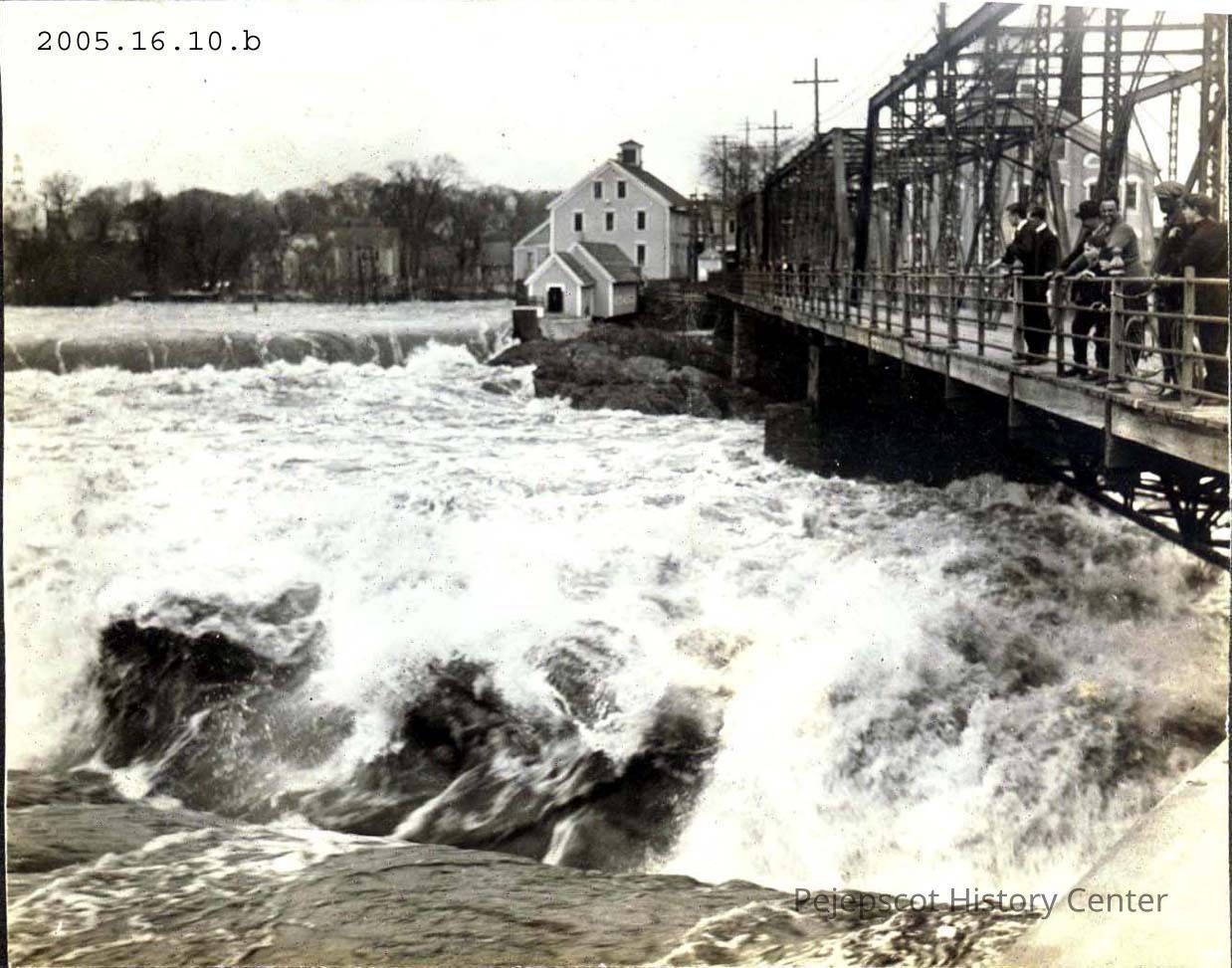 2- B/W photographs mounted on black paper (from a photo album): 1) aerial view of Androscoggin River at Brunswick/Topsham centers, circa before 1932, and 2) View of people on bridge over Androscoggin River watching flood waters. The bridge they are standing on was destroyed in the flood of 1932.Collection