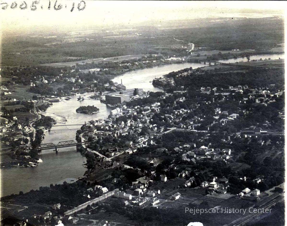 1) aerial view of Androscoggin River at Brunswick/Topsham centers, 2) View of people on bridge over Androscoggin River.Entry/Object ID
