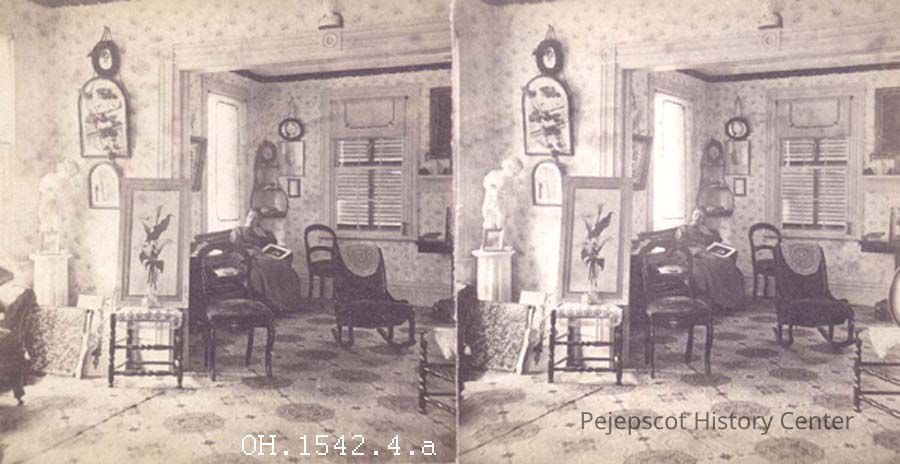 A B/W stereo view of John Furbish's parlor at 10 Cumberland Street, Brunswick, ME. It is identified as the "West Parlor." There is a woman sitting on a sofa in the corner. She is identified as "Aunt Kate" in one place and as "M. Alice" in another place. Undated
