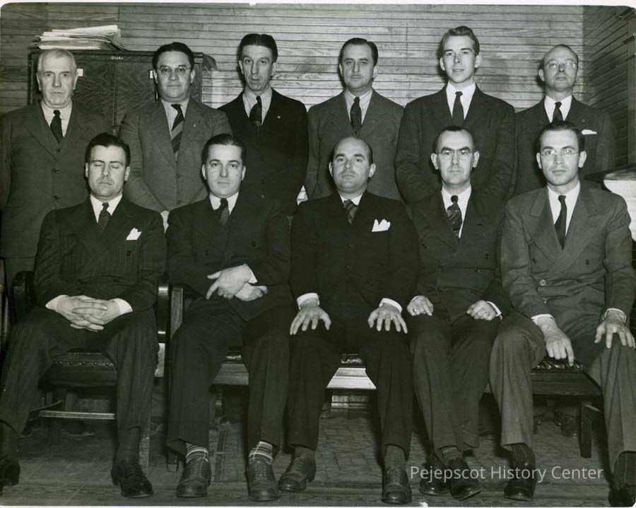 A B/W photograph of directors and officers of the Chamber of Commerce from the late 1930s to the early 1940s. Front row, left to right: James Black, Al Tardiff, Henry Baribeau, Robert Pomeray, Alfred Senter.