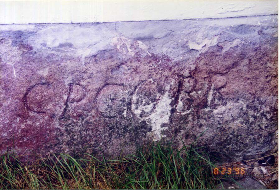 Color photo of the corner stones of 11 Dunning Street, inscribed , "C.P. Cobb," referring to the original owner of the house, Charles P. Cobb. 8/23/1996.