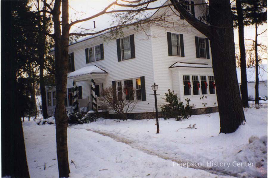 A color photograph of the house at 12 Boody Street, Brunswick, ME, in the snow. The photograph is taken facing the front and side of the house from the corner. Undated.