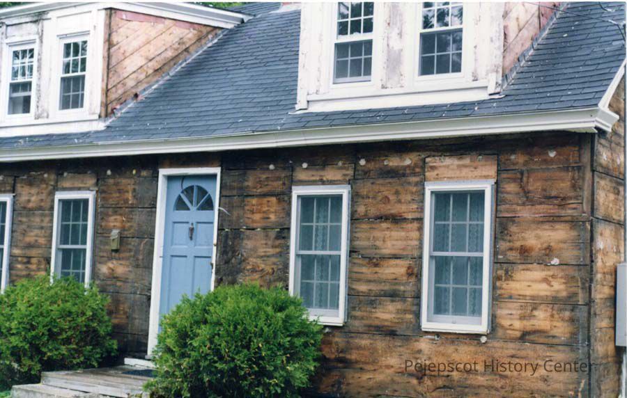 Color photo of 12 Potter Street, Brunswick, ME, showing restoration work. The clapboards have been removed revealing the sheathing. No date.