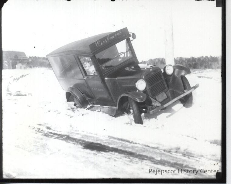Photo of a 1920s era truck stuck in the snow.