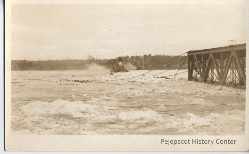 1936 Androscoggin River flood, Maine Central Railroad bridge destroyed. Brunswick and Topsham, Maine.Lexicon