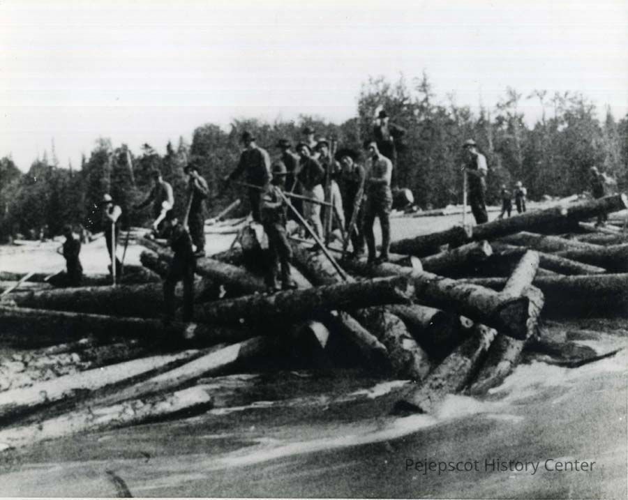 B/W photo of a group of men standing on some logs in the Androscoggin River during the 1936 flood. 1936.