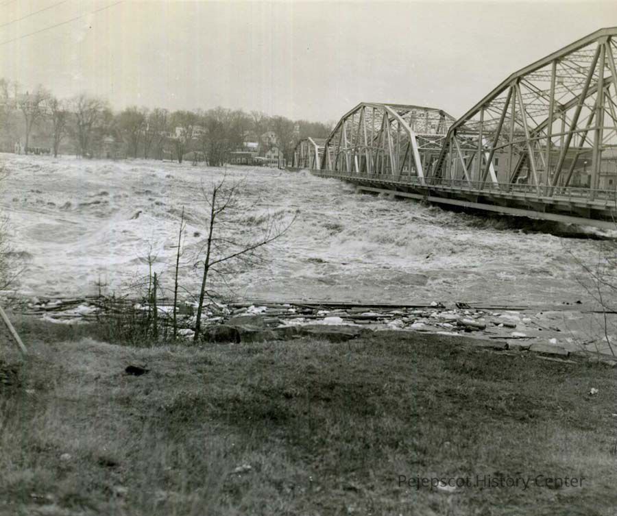 B/W photo of the Frank J. Wood bridge during the 1936 flood. Brunswick, ME. 1936.