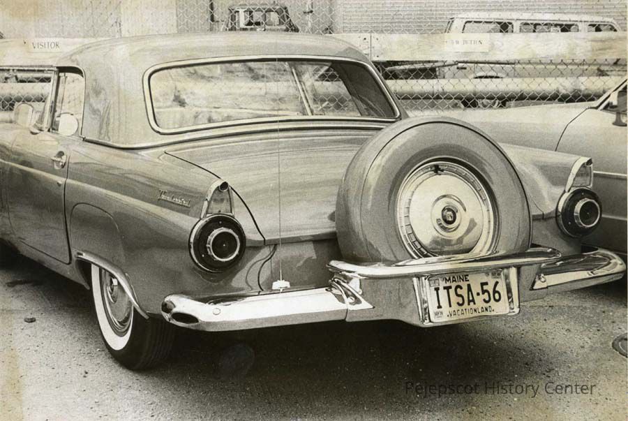 An undated black and white photograph of a 1956 Thunderbird owned by Frank Leavitt Jr. of Topsham.
