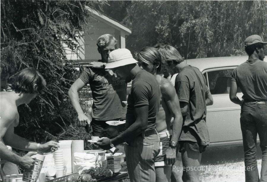 B/W photo of members of the 1972 U.S. Men's Olympic Track team at the home of Doug and Nan Morrell, Mere Point, Brunswick, ME. The team was at Bowdoin College training prior to going to the Munich Olympics. The man on the far right may be Reynaud Syverne "Rey" Robinson, one of three American 100 meter sprinters; next to him is Steve Prefontaine of the University of Oregon and American record holder 3k up to 10k. Prefontaine, who died in an automobile accident in 1975, held records in seven different distance track events. 7/1972.Lexicon