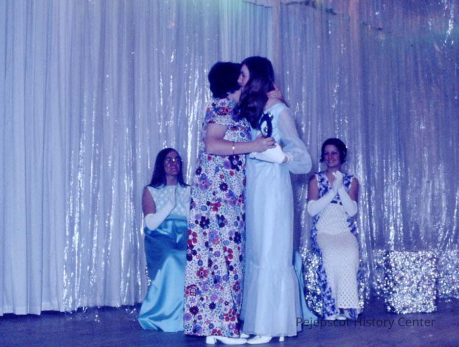A 35 mm color slide of Mary Anne Licameli, an award winner in the 1973 Miss Teen Queen Pageant. Seated are Diane Racine on the left and Althea Kinney on the right. The woman hugging the winner is unknown. The slide is marked , "19." Undated