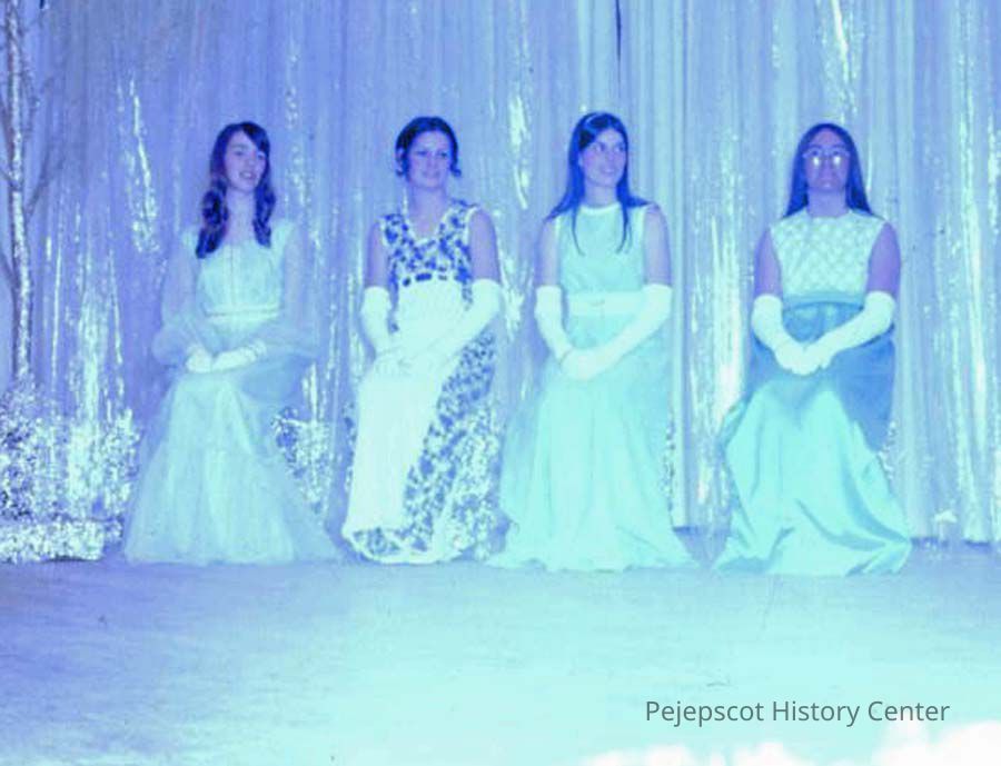 A 35 mm color slide of contestants in the 1973 Miss Teen Queen Pageant. They are left to right: Mary Anne Licameli, Althea Kinney, Susan DiEdwardo and Diane Racine. The slide is marked, "2" and in red ink, "2-38." Undated