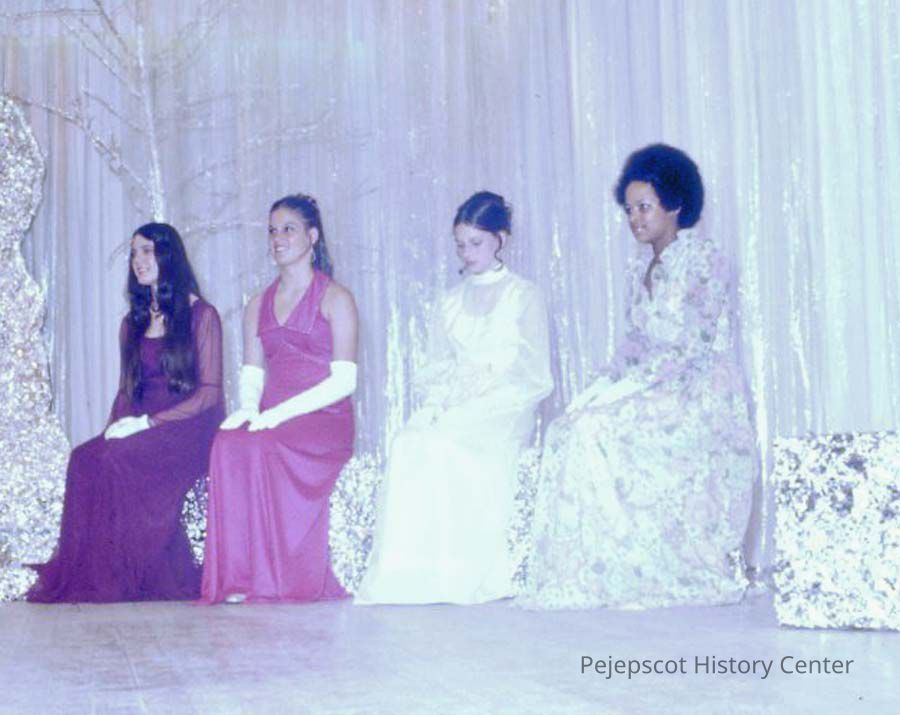 A 35 mm color slide of four contestants in the 1973 Miss Teen Queen Pageant. They are left to right: Barbara Aldridge, Kathy Livernois, Gale Cowley and Diana Johnson. The slide is marked, "3" and in red ink, "2-39". Undated