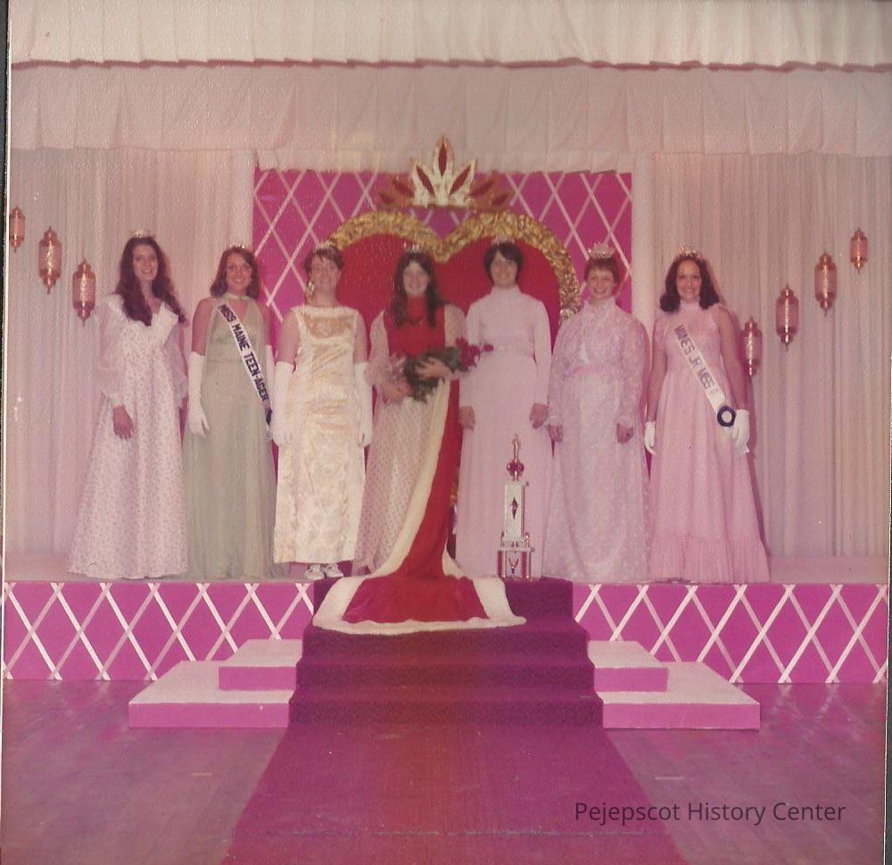1974-75 Brunswick Teen Queen Debra Jellison center with visiting queens and past Teen Queens are barbara Aldrige 1873-74, Miss Maine Teenager Lisa Frateschi, Agnes Racine 1972-73, Doris bernier 71-72 , Sharon Hinckley 68-69 and maine's Jr. Miss Pauline Cloutier.Collection
