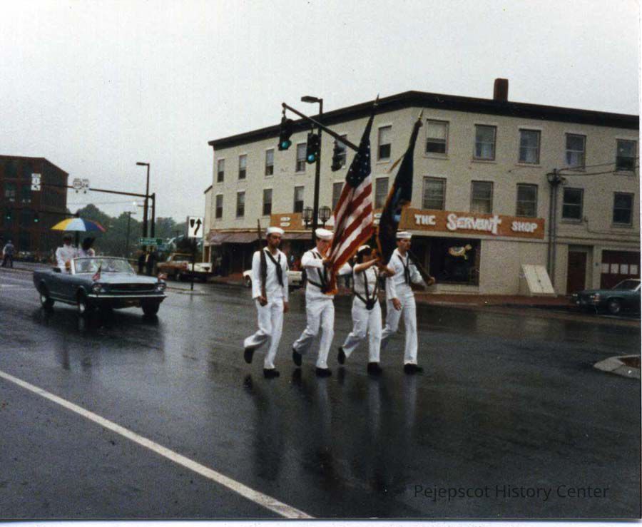 A color photo of the U.S. Navy Color Guard marching in the 1985 Memorial Day Parade on Maine Street in Brunswick, Maine.