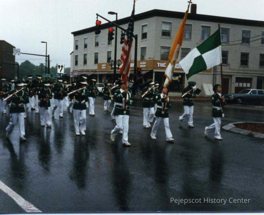 A color photo from the 1985 Memorial Day Parade in Brunswick, Maine showing an unidentified band.