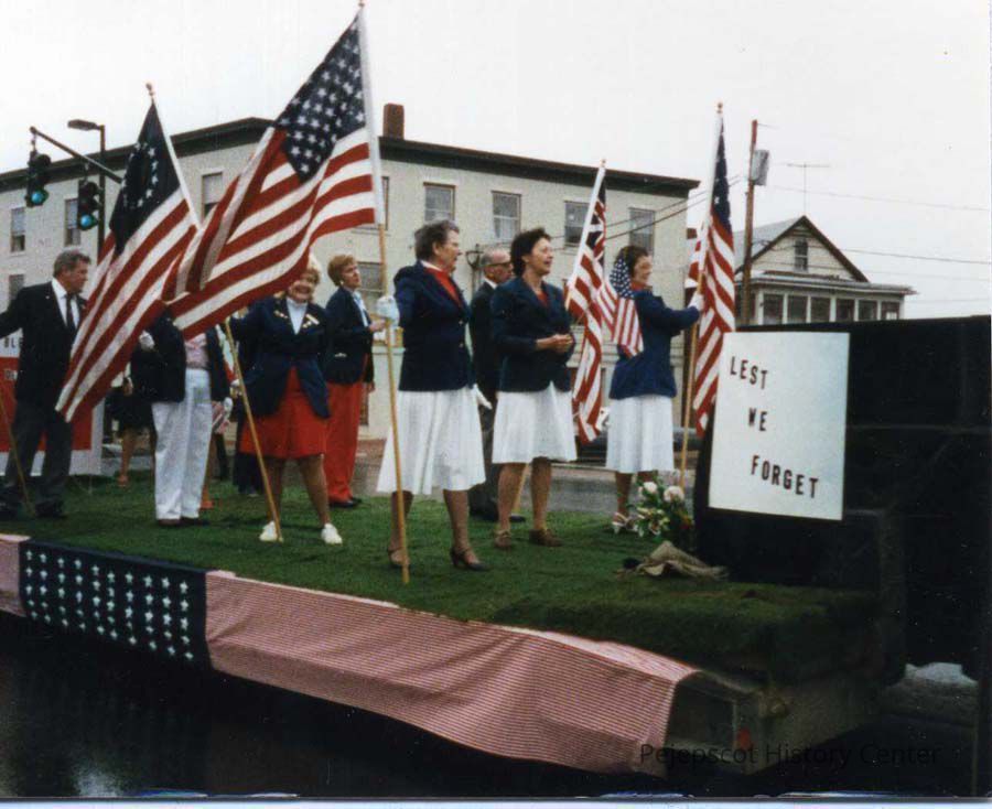 A color photo of an unidentified float with men & women holding a variety of American flags with a sign that reads "Lest We Forget" in the 1985 Memorial Day Parade on Maine Street in Brunswick, Maine. The intersection of Maine and Mason Streets is behind the float.