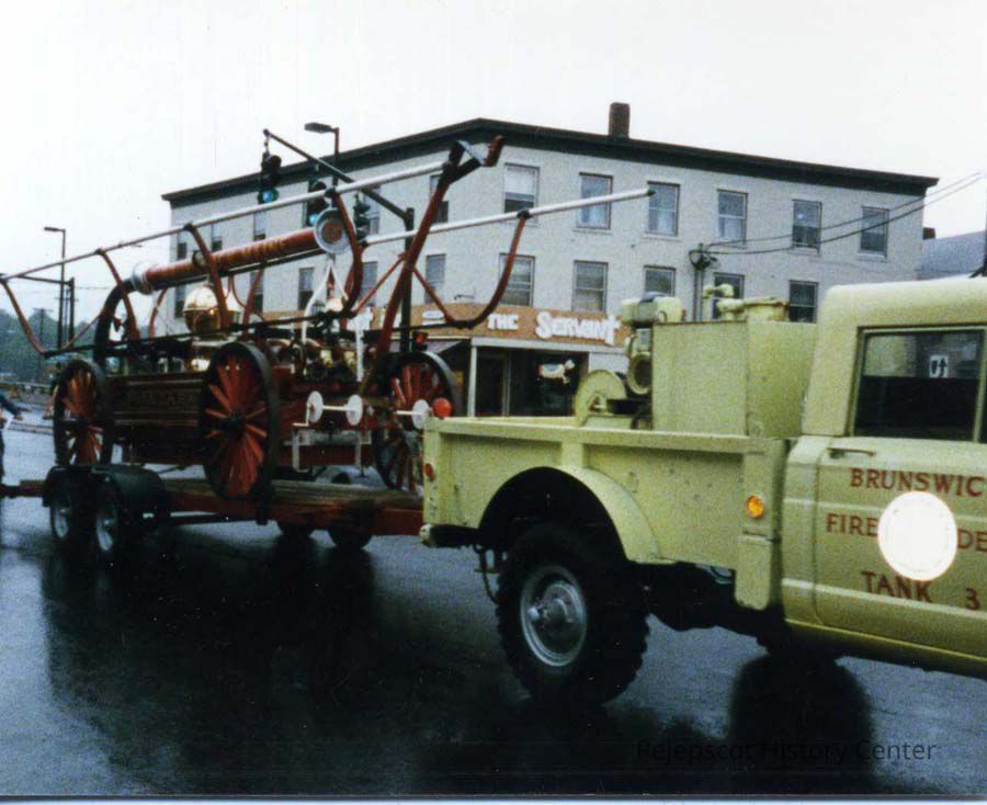 A color photo of a Brunswick fire truck pulling a trailer with the old Niagra fire engine on it in the 1985 Memorial Day Parade on Maine Street, Brunswick, Maine.