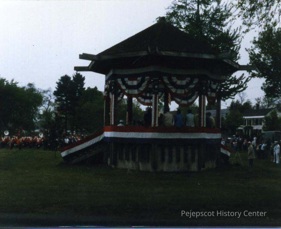 A color photo of the gazebo on the Brunswick Mall during the 1985 Memorial Day Parade, Brunswick, Maine.