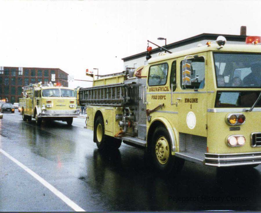 A color photo of the Brunswick, Maine Fire Engine #1 in the 1985 Memorial Day Parade. Cabot Mill / Fort Andross is visible in the background.