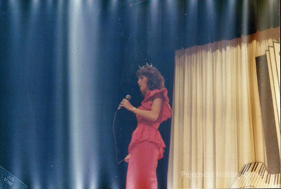 A color photograph of 1986 Miss Brunswick Doreen Derosier singing "Climb Every Mountain"