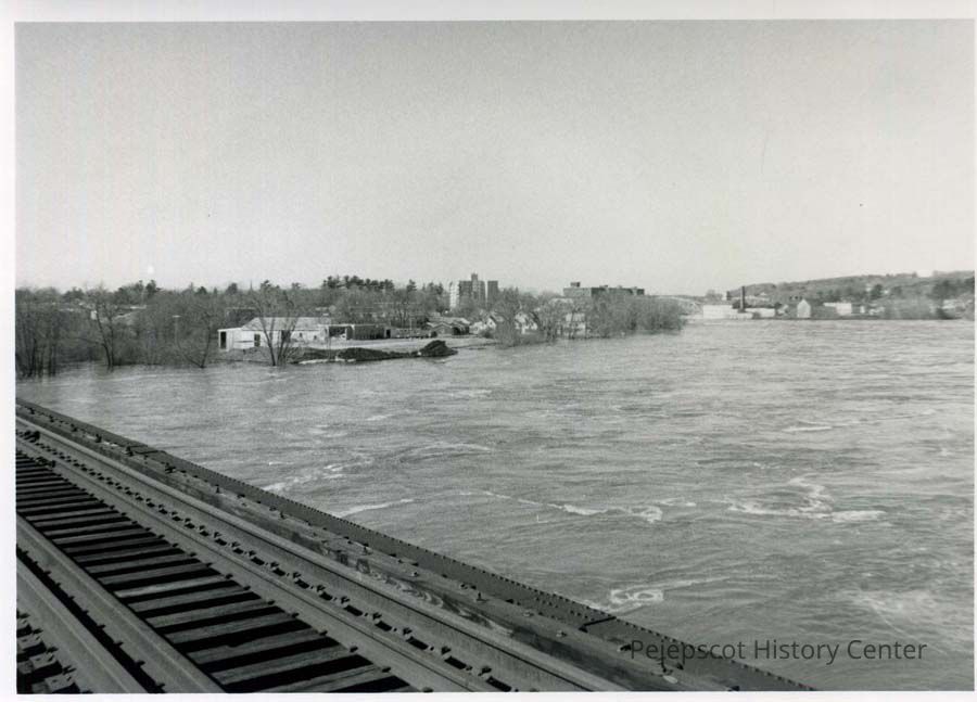 Photo of 1987 Androscoggin River flood taken from Maine Central Railroad bridge, showing distant views of Brunswick, Maine (left), and Topsham (right).