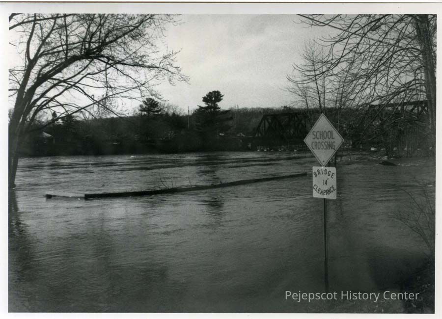 Photo of 1987 Androscoggin River flood looking north across flooded Mill Street toward the Black Bridge, Brunswick, Maine. Topsham on far bank.