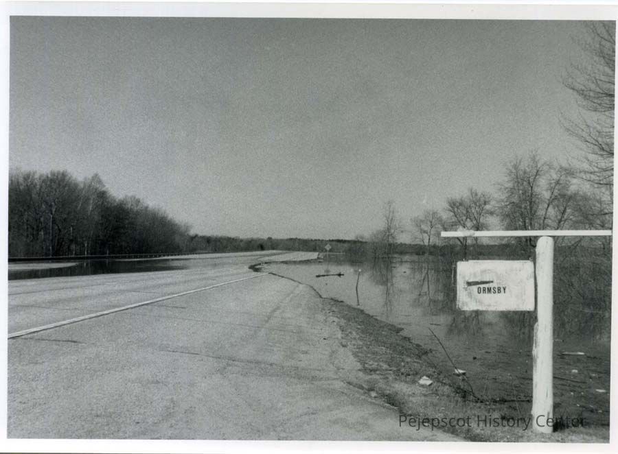 Photo of 1987 Androscoggin River flood below Brunswick, Maine, showing flooding on U.S. Highway 1.