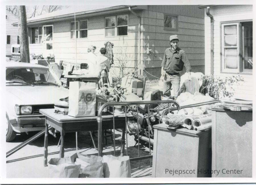 Photo of 1987 Androscoggin River flood showing Water Street residents moving their belongings in preparation for the flood. Brunswick, Maine.