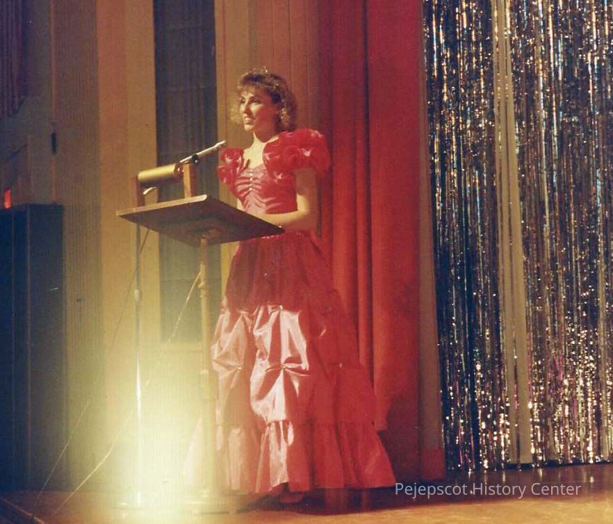 A color photograph of 1991 Brunswick Teen Queen Robin Moody giving her farewell address