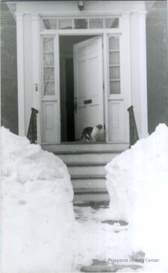 B/W photo of the doorway of 2 Lincoln Street, Brunswick, ME, in winter. A cat stands in the doorway. No date.Lexicon